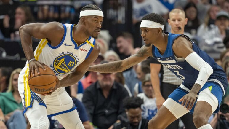 جيمي بتلر غولدن ستايت ووريورز واجهت مينيسوتا تيمبروولفز المباراة 2 من سلسلة الدور نصف النهائي من المؤتمر الغربي في المركز المستهدف في مينيابوليس يوم الخميس.