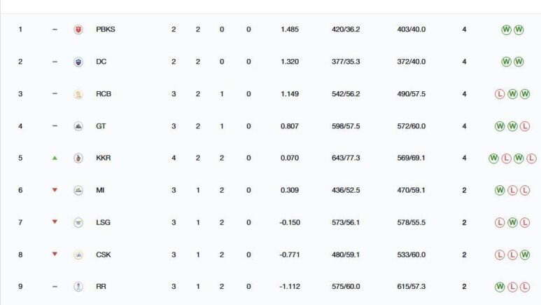 فاز KKR بانتصارين لأربع مباريات في IPL 2025 ولديه أربع نقاط في حسابهم ، حيث يكون معدل التنفيذ الصافي +0.070. كما أن ملوك البنجاب ، وعواصم دلهي ، و Royal Challeners Bengaluru ، و Gujarat Titans لديهم أربع نقاط لكل منهما. إنهم يتقدمون على KKR في جدول نقطة IPL 2025 بسبب ارتفاع معدل التنفيذ الصافي.