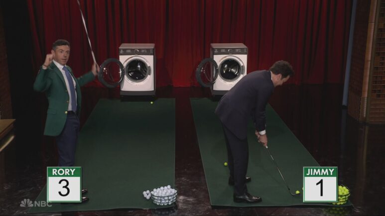 في حديثه في برنامج الليلة مع جيمي فالون ، يكشف روري ماكلروي أنه تلقى مكالمة من السير إلتون جون بعد فوزه بالماجستير قبل أن يأخذ المضيف في لعبة رمزية لطفولته.