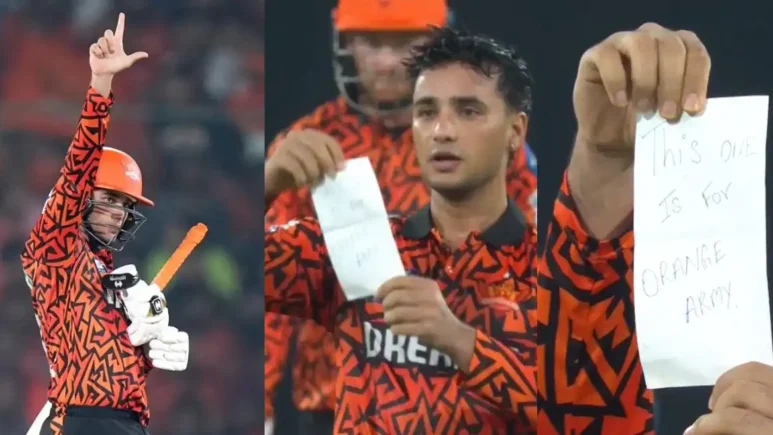 بينما وصل أبهيشيك إلى قرنه ، اندلع حشد الصعود. رفع خفافيشه وإزالة خوذته ، امتد يده في جيبه وأطلق ملاحظة صغيرة من الورق ، ممسكًا به في الهواء حتى يتمكن الجميع من رؤيته. قراءة القراءة ، “هذا واحد للجيش البرتقالي”– تكريم مخلص لأعمل المشجعين متحمسون لـ SRH. أثارت هذه الإيماءات جنونًا على الشبكات الاجتماعية والمعلقين اليسار وزملاء الفريق.