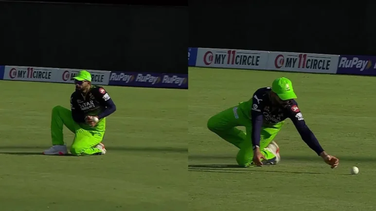 أطلقت Suyash Sharma التسليم الكامل في الوسط ، وقد تقدم Dhruv Jurel من أجل LOF على الأرض. لكن Jurel لم يتمكن من الوقت بشكل مثالي وانتهى به الأمر إلى انزلاق الكرة في وقت طويل ، حيث كان Virat Kohli في وضع مثالي لالتقاط دون أي حركة.