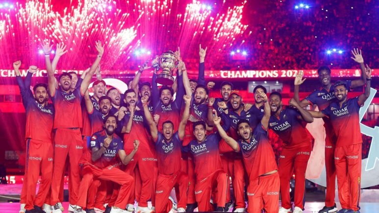 رويال تشالنرز بنجالورو (RCB) قائد الفريق راجات باتيدار قامت بكأس IPL 2025 مع زملائه على المنصة بعد هزيمة ملوك البنجاب في النهائي يوم الثلاثاء 3 يونيو. رحب ملعب ناريندرا مودي في أحمد آباد بالتأثير العالي لأوكتان.