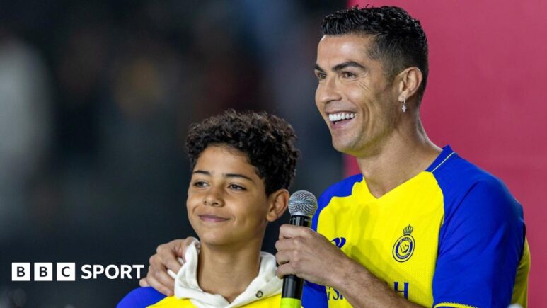 كريستيانو رونالدو جونيور ، 14 عامًا ، في الناصر في المملكة العربية السعودية مع والده ، الذي وقع على النادي المحترف في ديسمبر 2022.