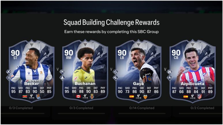 هذا مشابه لتلك المنشورة سابقًا دوري إبرماري ولاعب Edivisie Chick SBCS ، حيث كان من المفترض أن يتم كسب خيارات اللاعبين الذين يضم أربعة لاعبين. تقدم بطولات EA FC 25 FC Pro Elliga SBC إصدارات إلى 90 شخصًا من Azpilicueta و Becker و Gaya و Buchanan ، وجميع اللاعبين يتلقون دفعة هائلة إلى ملاحظاتهم وإحصائياتهم الإجمالية.