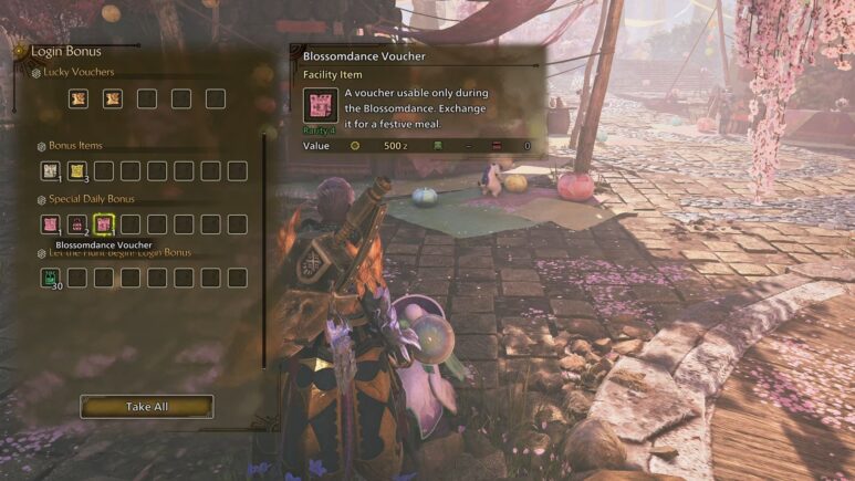 يمكن جمع قسائم الزهور من مكافأة الاتصال يوميًا خلال مهرجان فلور دي لوجيون ، محدودة يوميا لطيفة (تتفاعل مع مكتب دعم Palico) و Sakuratide α درع زهرة نعمة.