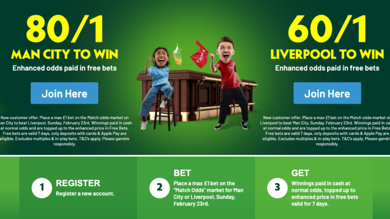- ضع رهانًا أقصى قدره 1 جنيه إسترليني في سوق تصنيف مباريات ليفربول للتغلب على مان سيتي ، الأحد ، 23 فبراير.