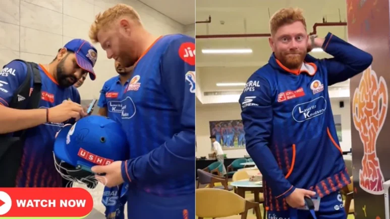مشاهدة: جوني بيرستو يسأل روهيت شارما للتوقيع على خوذته بعد إطلاق IPL Mumbai Indians 2025