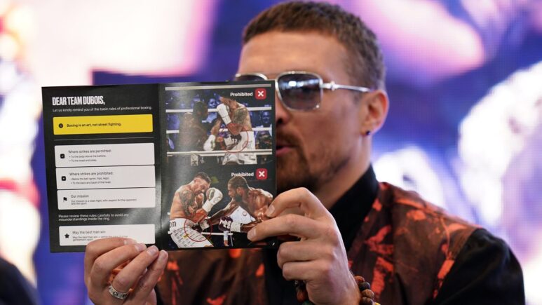 احتفل Usyk بأول مؤتمر صحفي للزوج من خلال مطالبة Dubois بالتوقيع على صور للعديد من الطلقات “المنخفضة” التي هبطها خلال قتالهم قبل عامين.
