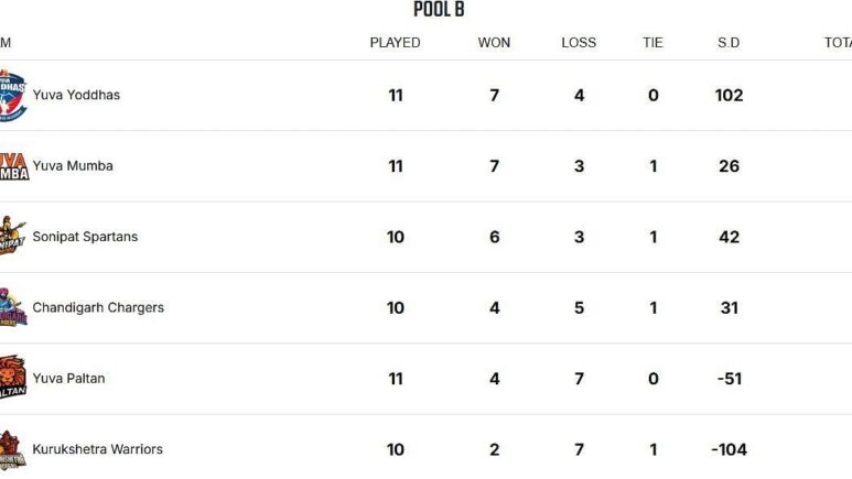 خسر يوفا بالتان ، في المركز الخامس ، مباراته السابعة من أصل 11 عامًا ولديه الآن 25 نقطة ، وهو اختلاف سلبي قدره -51. فاز Kurukshetra Warriors ، في الجزء السفلي من الطاولة ، للتو من ألعاب من 10 مباريات لعبوها وأصبحت الآن 14 نقطة ، وهو اختلاف كبير قدره -104.