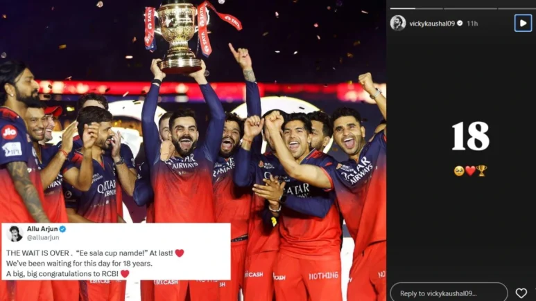 أرسل النصر التاريخي لـ RCB التموجات إلى صناعة الترفيه ، مع العديد من المشاهير الذين يعبرون عن إثارةهم وإعجابهم بالشبكات الاجتماعية. النجم الجنوبي ألو أرجون شارك في شريط فيديو مؤثر لابنه آيان يصبح عاطفيًا بعد النصر ، مع الاستيلاء على تأثير الأجيال على النصر. بوليوود القلب فيكي كوشال نشرت قصة Instagram الصادقة التي تضم “18” الجريئة – سنوات من انتظار RCB – مصحوبة بوجه وقلب أحمر وكأس الرموز التعبيرية ، تعكس مشاعر ملايين المعجبين.