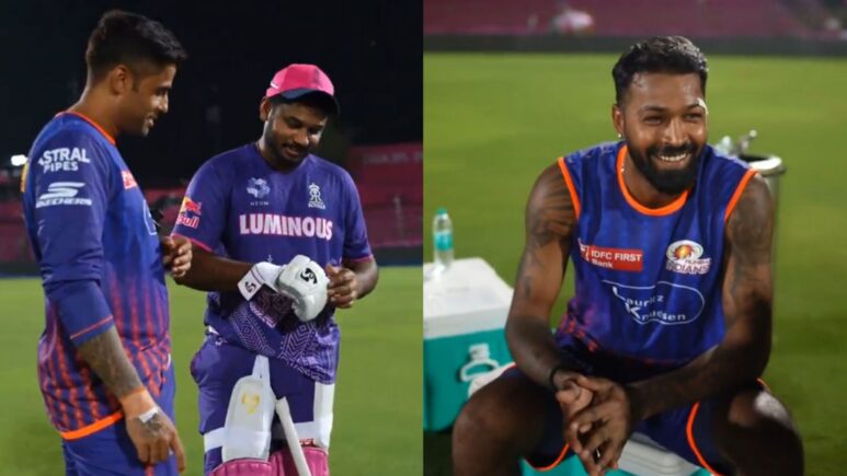قبل يوم واحد من المباراة ، 30 أبريل ، شارك حساب RR الرسمي لـ RR في مقطع فيديو عن Sanju Samson مع نجوم MI هاردي بانديا وسورياكومار ياداف ، مع زميله في الفريق ريان باراج. أثناء حمل القفازات الجريئة في يده ، قال سانجو في الفيديو: