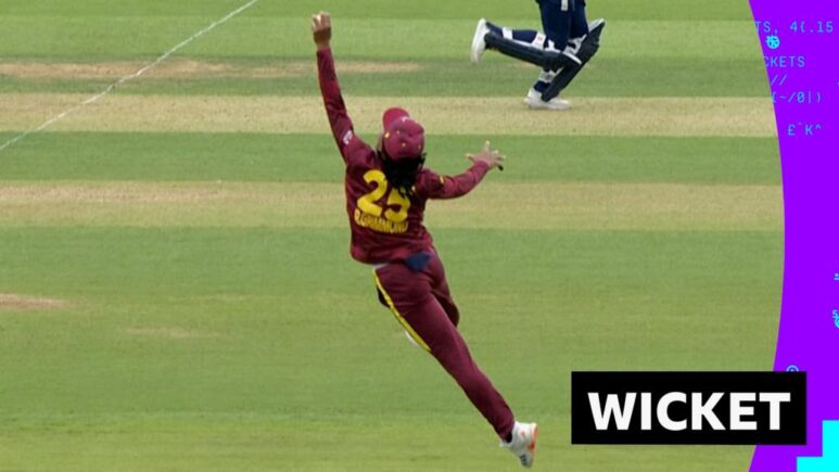 لاحظ كيف يأخذ بستاني جزر الهند الغربية ، ريالانا غريموند ، التقاط ممتازة بيد واحدة لتجاهل إيما لامب من إنجلترا في اليوم الثاني الدولي في ليستر.