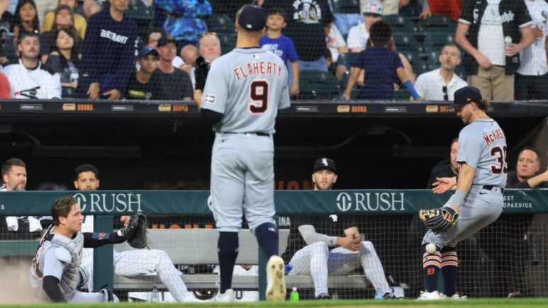 تجمع مستقبلات نمور تاميل ديترويت ديلون ديجلر وزاك ماكينري لالتقاط سخيف في فوزهما 13-1 MLB على شيكاغو وايت سوكس.