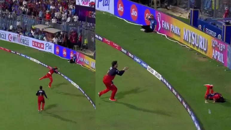 ضرب الكرة في منتصف العداد العميق ويبدو أن الكرة تهدف إلى الإبحار على الحدود. ومع ذلك ، كان لدى Phil Salt خطط أخرى. جاءت المباراة الافتتاحية لـ RCB المسؤولة وأخذ الصيد فوق رأسه أثناء وجوده في الهواء قبل أن يدرك أن الزخم أخذه فوق الأوتار الحدودية. سرعان ما أطلق الكرة داخل الميدان حيث اشتعل تيم ديفيد الكرة لإكمال مشكلة.