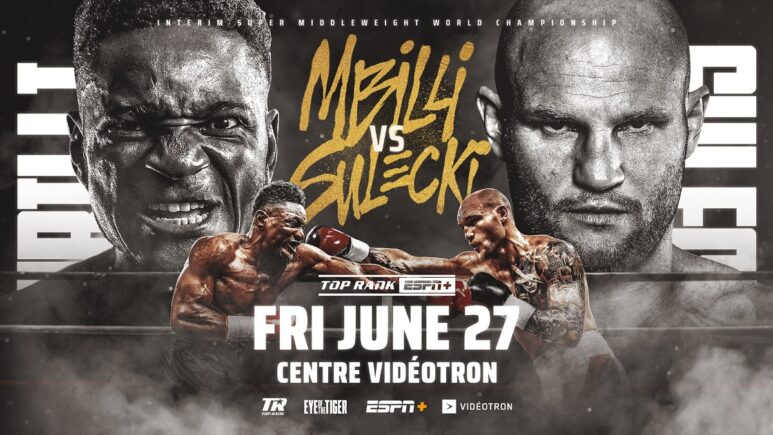 يواجه كريستيان مبيلي ماسيج سوليكي من أجل 168 جنيه من WBC في 27 يونيو ، العيش في ESPN+ في جولة 12 في مركز Videotron في مدينة كيبيك. تعرض Mbilli (28-0 ، 23 KOS) تصنيفها رقم 1 مع WBC لخطر مواجهة #7 Sulecki (33-3 ، 14 KOS) في معركة لوضعها للحصول على فرصة لللقب العالمي ضد البطل الموحد Canelo álvarez.