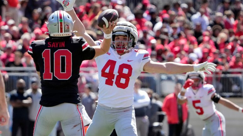 لا يزال الأبطال الوطنيون الحاكم ، ولاية أوهايو بوكيز ، في ذروتهم إذا كانت مباراة الربيع يوم السبت مؤشرًا. خرج جوليان سيل في المقدمة بثلاثة هبوط في الشوط الأول في طريقه إلى فوز 50-31 لفريقه.