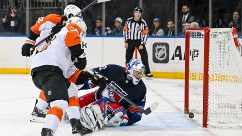 ال نيويورك رينجرز كانوا على الجانب الخطأ من 8-5 Walope في يد فيلادلفيا فلايرز يوم الأربعاء 9 أبريل في Madison Square Garden. سجل الطيارون خمسة أهداف في الفترة الثالثة ، بما في ذلك خيطان فارغان ، لإغلاق النصر العظيم.