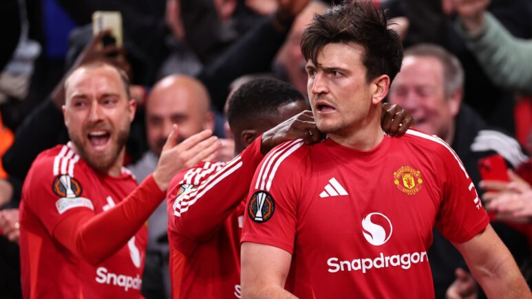 يحتفل لاعبون رجل UTD بالفائز المتوفى لهاري ماجواير ضد ليون