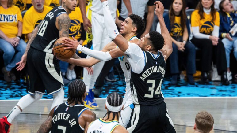 ميلووكي باكز و إنديانا بيسرز حارب في المباراة 2 من سلسلة الجولات الأولى من المؤتمر الشرقي يوم الثلاثاء في غايبريدج فيلدهاوس في إنديانابوليس. يوجه Pacers سلسلة 1-0.