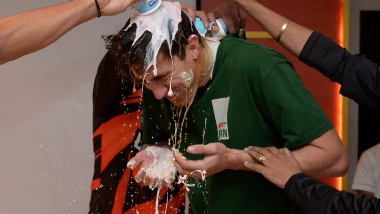 في المقطع الخفيف ، يُرى Cummins كعكة فرحان قذرة على وجهه قبل أن ينضم زملائه في الفريق ، ويغطيها بالكعك والمشروبات المرحة.