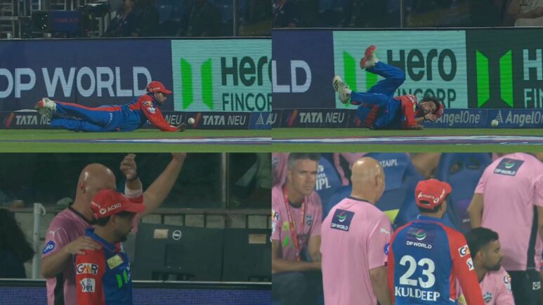 وقف Kuldeep Yadav على ساق صغيرة صغيرة ، وبمجرد أن لعب رنا الضربة ، ركض وتراجع لكنه انتهى به الأمر إلى دفع الكرة على الأوتار الحدودية. وبذلك ، انتهى كولديب ياداف أيضًا بإصابة نفسه.